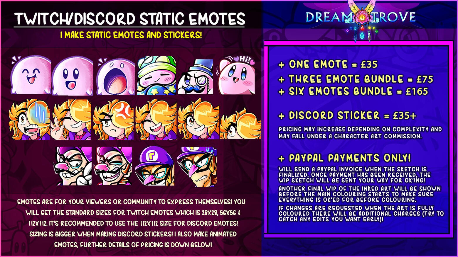 I also make both static and animated Emote Commissions for both Twitch and Discord! Info can be found in the Commission Sheets Below!