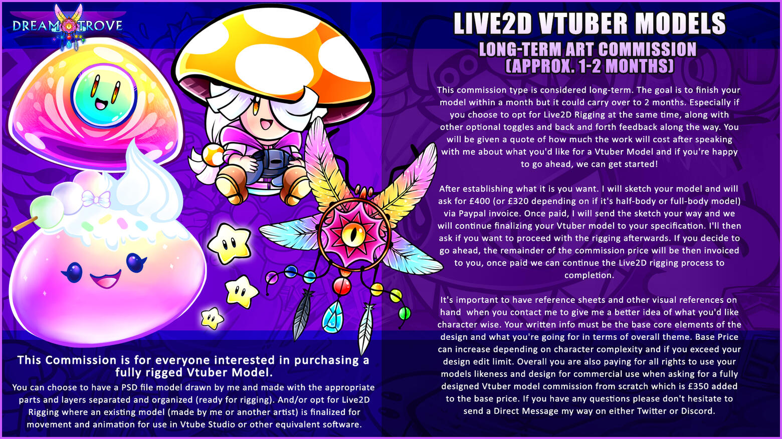 Below you can find further details about my Live2D Cubism Vtuber Model Pricing! Depending on the design of the model and the amount of toggles, animations etc. the price can vary from being higher or lower! This commission info is only a guide, it is always best to get a quote from me by getting in contact via DM through my Community Discord and telling me the details of your Vtuber Model Commission!